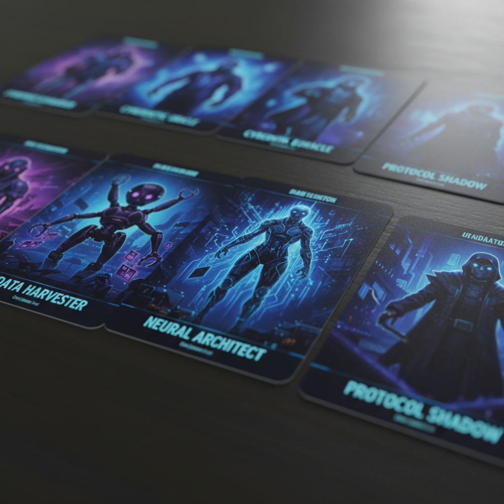 Each faction features 24 unique agent cards with specialized abilities. Build your network with Neural Architects, Data Harvesters, Compute Engines, and more.